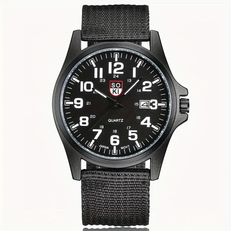 ساعة يد رجالية كاجوال بحزام نايلون خفيف وتصميم رياضي أنيق، مزودة بحركة كوارتز دقيقة وعرض للتاريخ، مثالية للاستخدام اليومي والهدايا.