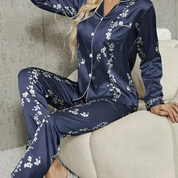 طقم بيجاما نسائي ستان قطعتين بنقشة زهور وأكمام طويلة – ملابس نوم ناعمة لجميع الفصول