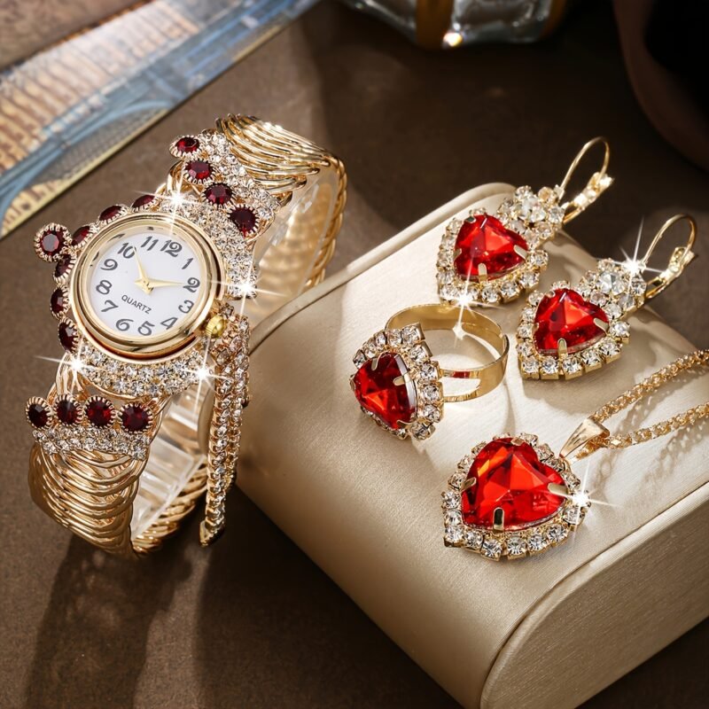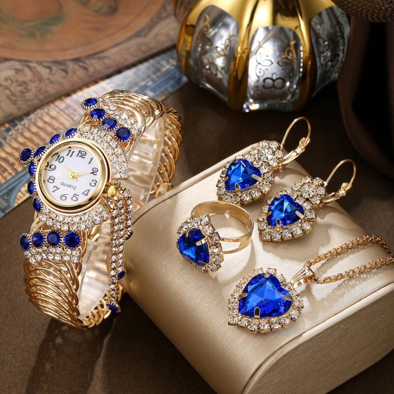 طقم 5 ساعات نسائية كوارتز فاخرة مع إكسسوارات – قلادة، خاتم، وأقراط، هدية مثالية