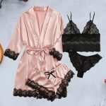 طقم ملابس نوم نسائي 4 قطع دانتيل أنيق – رداء بأكمام طويلة وقميص داخلي وسروال، مثالي للنوم والهدايا