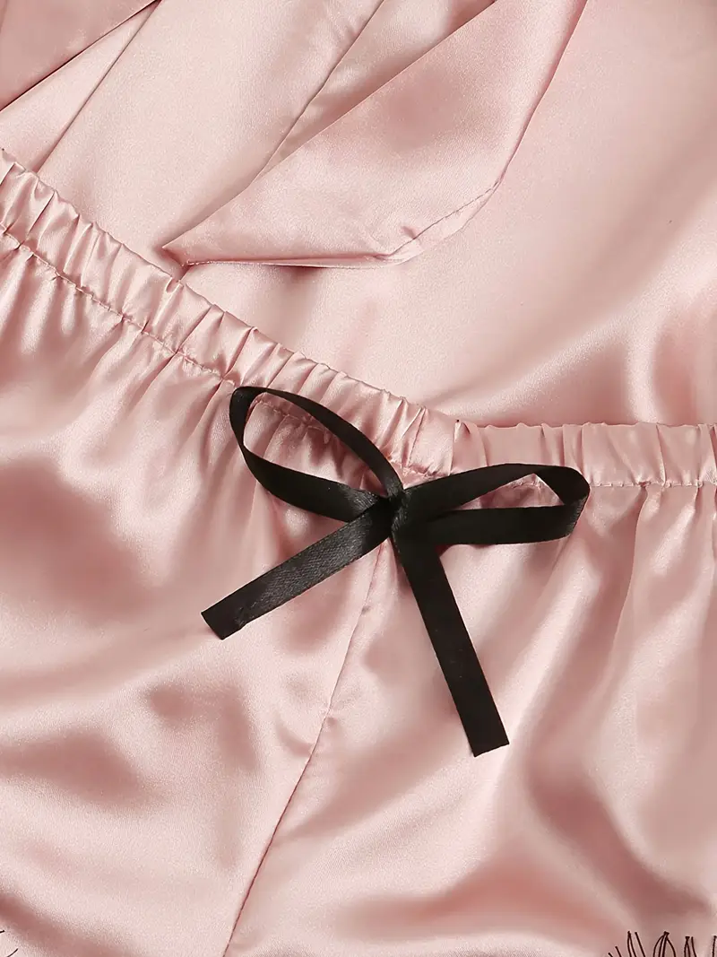 دللي نفسك أو قدّمي هدية فاخرة بهذا الطقم الراقي من ملابس النوم النسائية، المكون من 4 قطع أنيقة تشمل رداء طويل بأكمام وتصميم رقبة V مع حزام ناعم، وقميص داخلي وسروال بتطريز دانتيل أنثوي مميز.